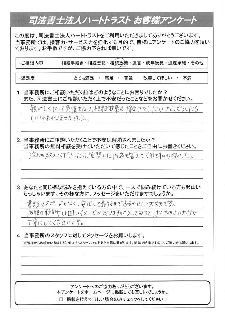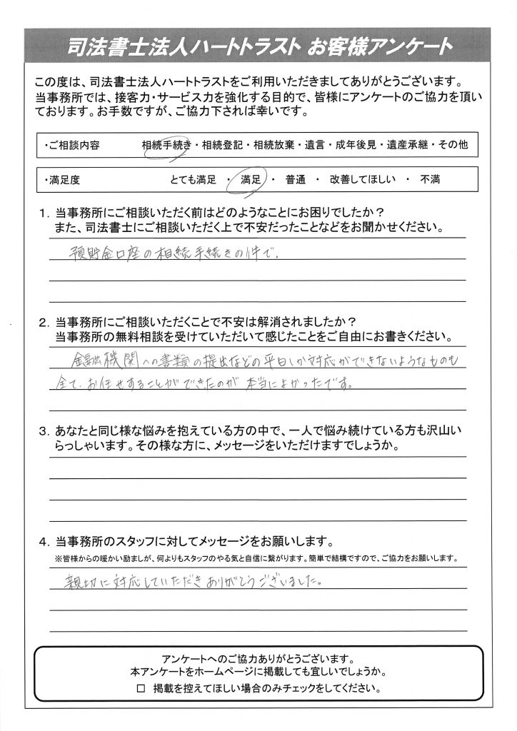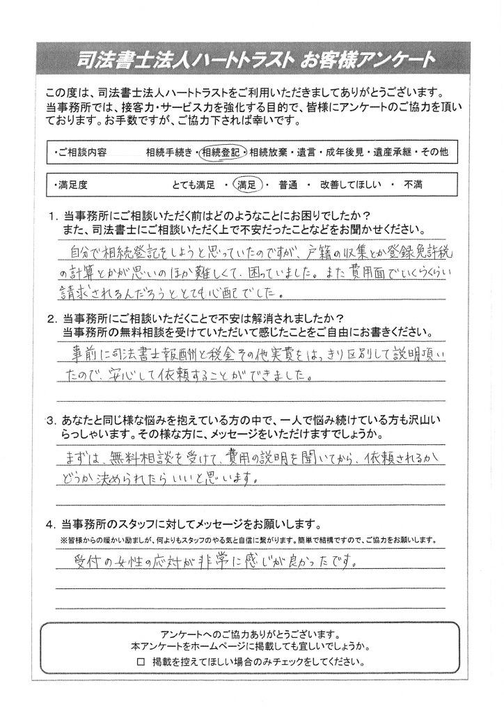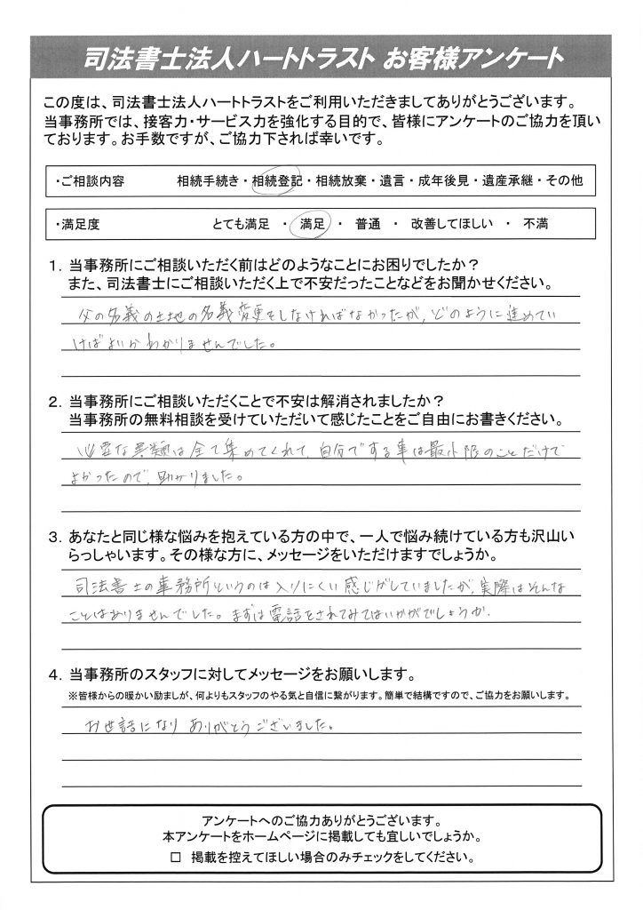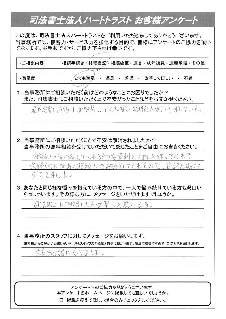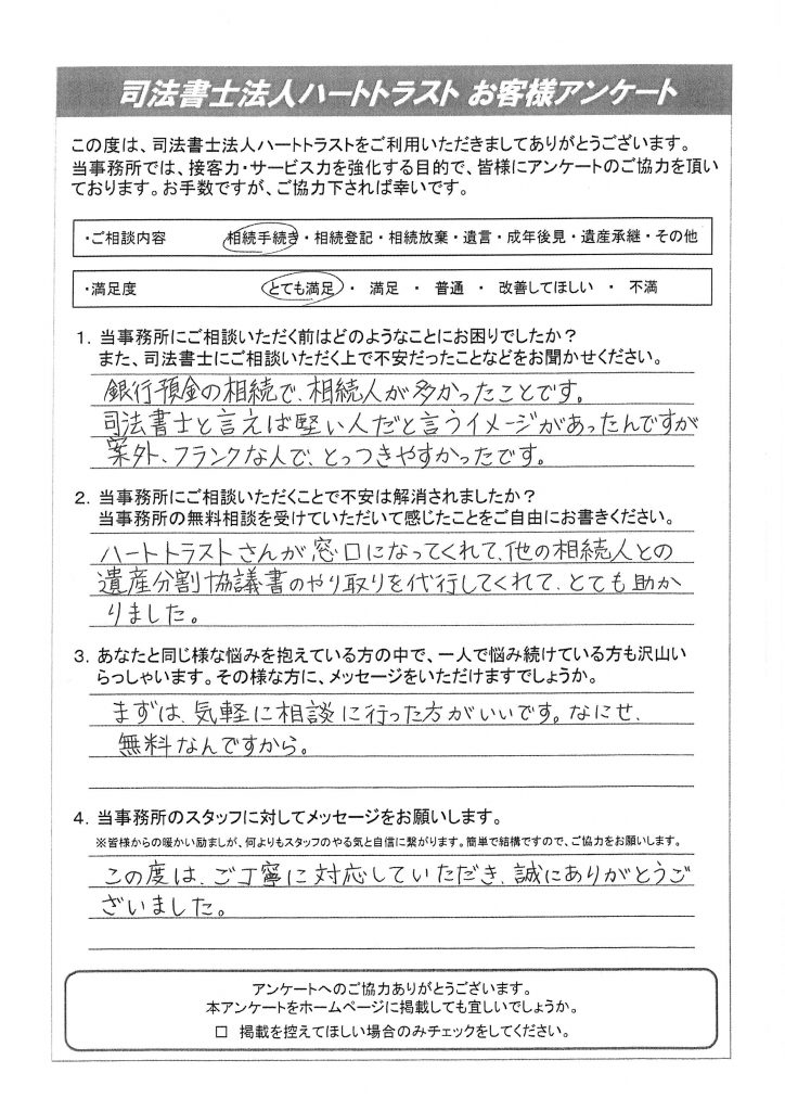 ハート・トラストさんが窓口になってくれて、他の相続人との遺産分割協議書のやり取りを代行してくれて、とても助かりました。