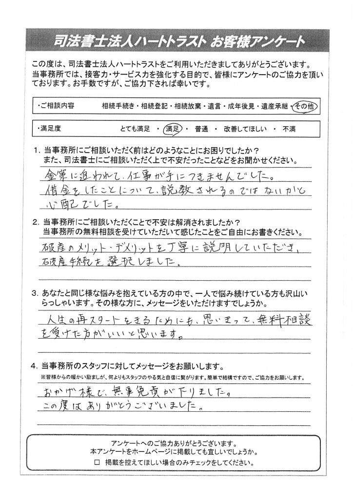 おかげ様で、無事免責が下りました。この度はありがとうございました。