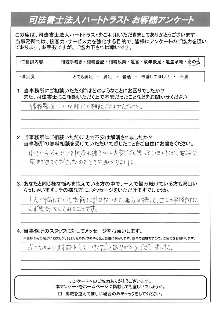 破産のメリット・デメリットを丁寧に説明していただき、 破産手続を選択しました。