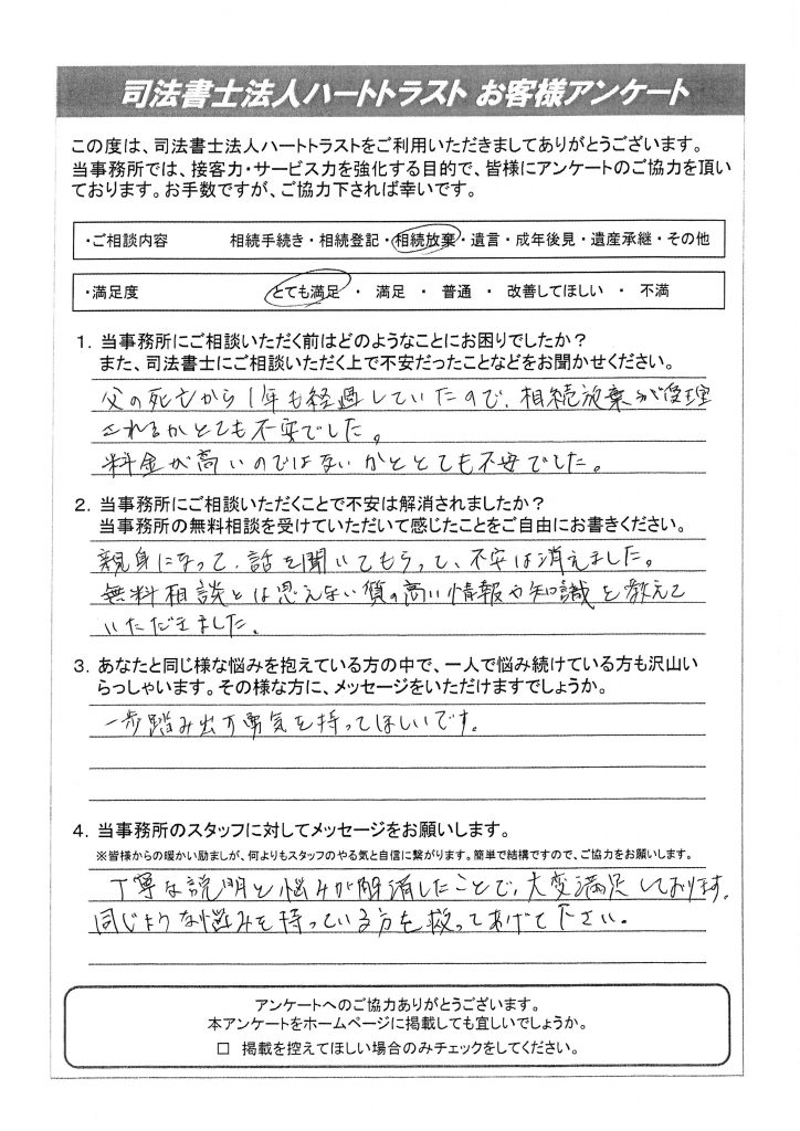 父の死亡から1年も経過していたので、相続放棄が受理されるかとても不安でした。