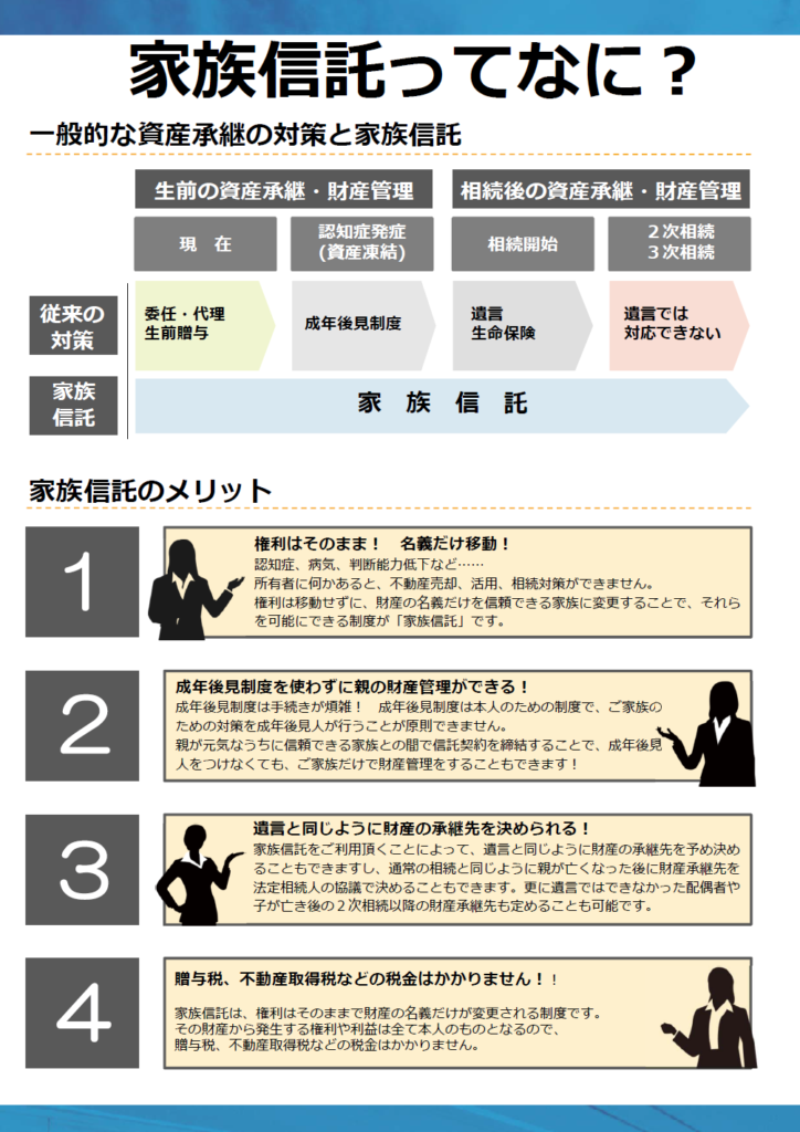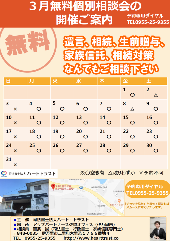 3月無料相談会のご案内 伊万里オフィスお知らせ 2019.02.16 伊万里オフィスでの無料相談会のご案内です。 日々、相続のご相談をいただいておりますが「遺言があったら…」「信託しておけば…」とのケースが年々増えています。司法書士、行政書士、家族信託専門士のライセンスを持った相談員が対応しますので、どうぞお気軽にお電話下さい。 伊万里オフィス:0955-25-9355 ニュース一覧に戻る その他の取り扱い業務 SERVICE01 相続登記 [相続手続き] SERVICE02 商業・法人登記 SERVICE03 不動産登記 SERVICE04 その他